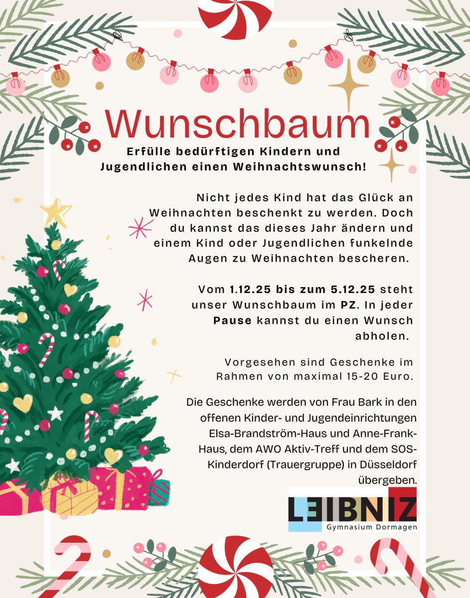 Erneut wurde der Wunschbaum wieder mit viel Herz und Engagement von Lena Dujakovic, Elisa Gillrath und Laura Wunderlich aus der EF betreut, die diese Aktion überhaupt erst möglich gemacht haben. Ein herzliches Dankeschön an sie.