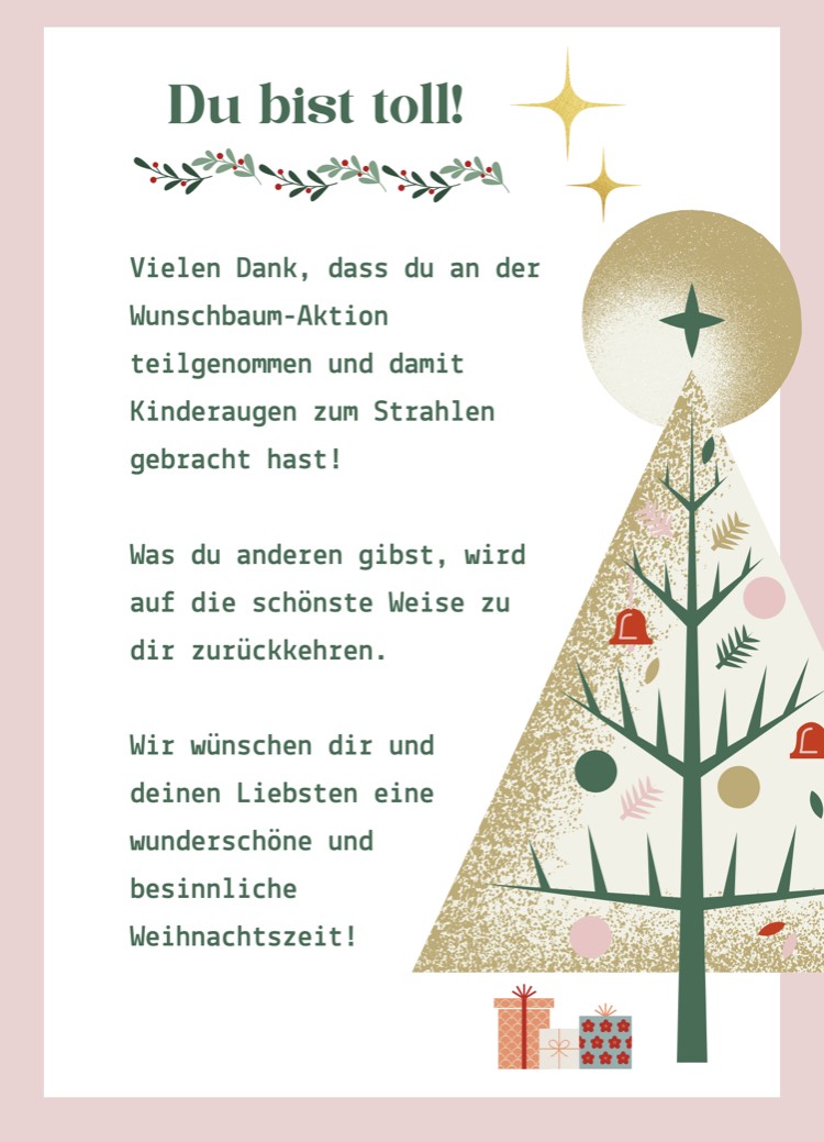 „Nicht jedes Kind hat das Glück, an Weihnachten beschenkt zu werden. Doch du kannst es dieses Jahr ändern und einem Kind oder Jugendlichen funkelnde Augen zu Weihnachten bescheren.“