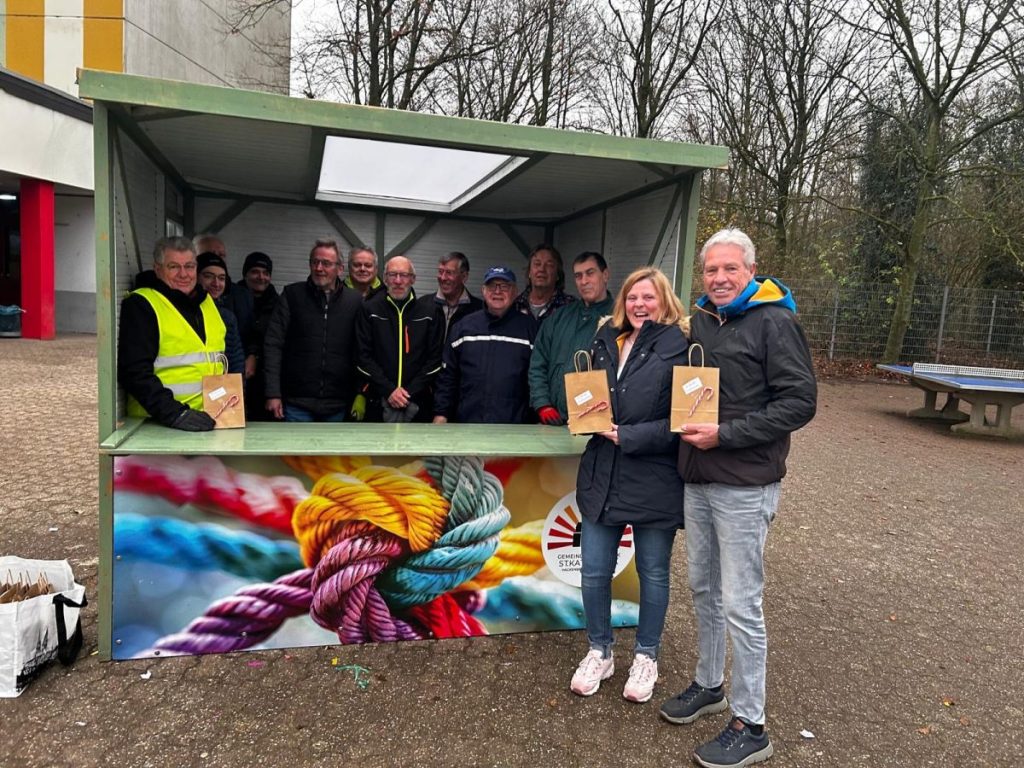 Den stimmungsvollen Abschluss des Jahres bildete eine Überraschung für die Rentnerband aus Hackenbroich. Auf dem Schulhof des Leibniz-Gymnasiums, beim Abbau der Buden des Weihnachtsmarktes, bedankte sich der Elternstammtisch bei den Rentnern für die Unterstützung mit einer Tüte „15 Minuten Weihnachten“ und einem Glückswürmchen.
