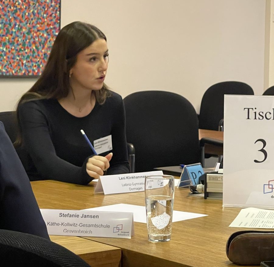 Auch in der Altersklasse II zeigte das Leibniz-Gymnasium eine starke Präsenz. Leni Klinkhammer vertrat gemeinsam mit Linn Fischer die Oberstufe des LGD und konnte sich in den Vorrunden durchsetzen. Im abschließenden, spannenden Finale zu der Frage „Sollen Kaufe jetzt, zahle später-Bezahlmodelle bei Online-Käufen verboten werden?“ sicherte sich Leni Klinkhammer schließlich den dritten Platz.