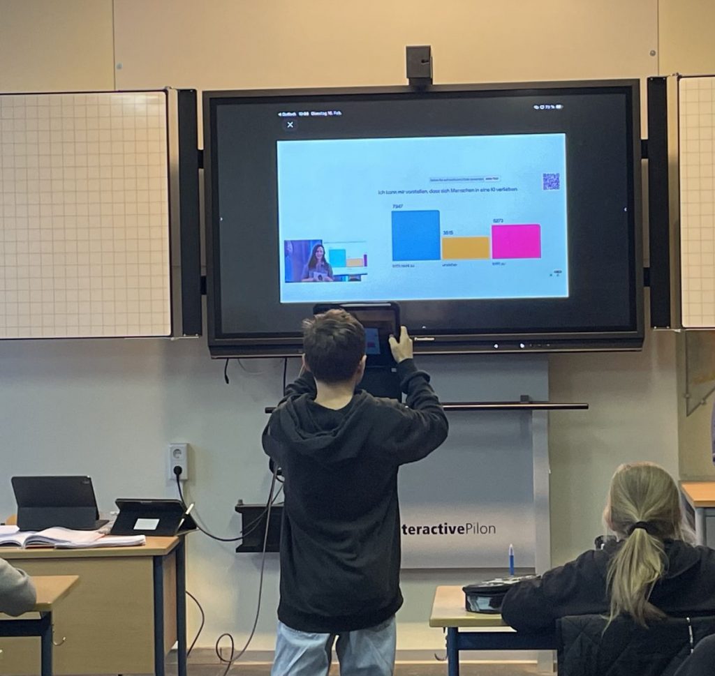 Nach mehreren Mentimeter-Umfragen arbeiteten die Klassen in Kleingruppen an drei unterschiedlichen Szenarien. In der anschließenden Vertiefungsphase programmierte die 8b eigene KI-Bots, während die 7a und die 8d über das Zitat von Mark Zuckerberg diskutierten: „Most of your friends will be AI“. Unterstützt wurden die Klassen von den Medienscouts Arianne, Johanna, Paulina und Mattis.