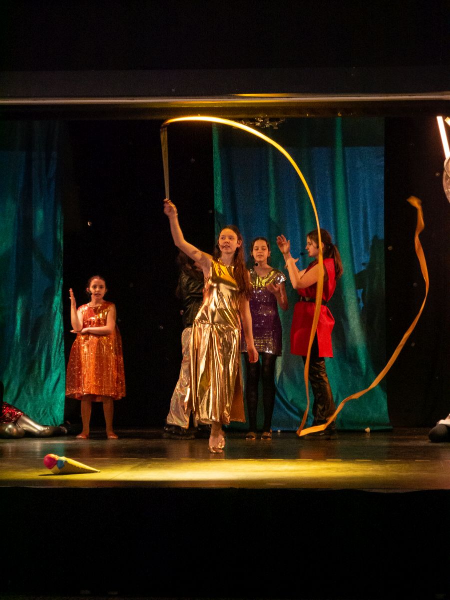Die 21 Darsteller*innen der Musical-AG unter der langjährigen Leitung von Gabriele Sperling überzeugten gesanglich, tänzerisch und schauspielerisch auf ganzer Linie und entfalteten eine spannende Geschichte rund um das Erlöschen des Sterns Oma Galaxos. Diese wurde eingebettet in eine Rahmenhandlung, bei der Opa (glaubwürdig verkörpert von Lehrer Falko Krause) seiner Enkelin (Ina Mrosowski) erklärt, wie die Sternbilder an den Himmel kommen und das Kind wie auch das versammelte Publikum auf eine Zeitreise schickt: in den Mond schauen, ohne zu zwinkern – und ab geht`s!